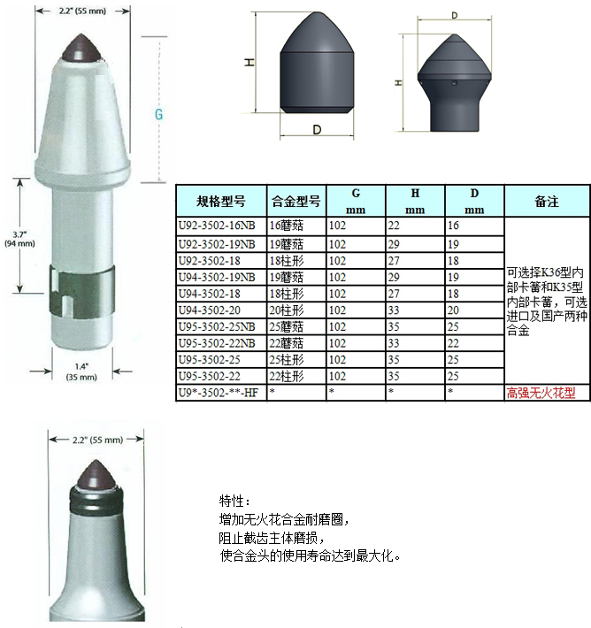 煤截齒規格型號:U92-3502-16NB、U92-3502-19NB、U92-3502-18、U94-3502-19NB、U94-3502-18、U94-3502-18、U95-3502-25NB、U95-3502-22NB、U95-3502-25、U95-3502-22、U9*-3502-**-HF